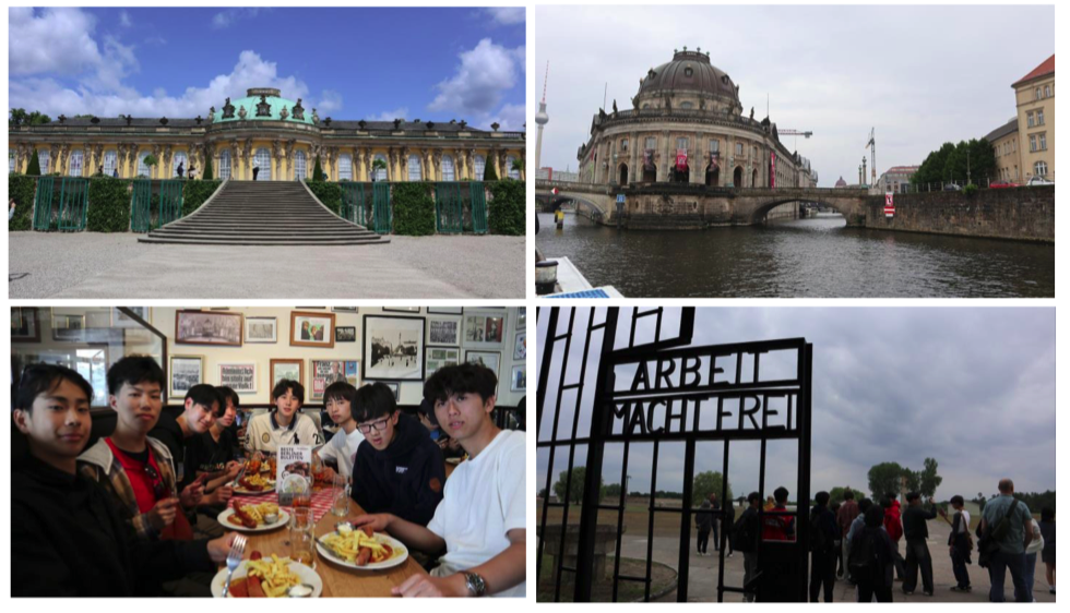 高校 2、3 年生の研修旅行は、6 月9日(月)~13 日(金)にドイツ・ベルリンを主な訪問地とし、歴史と文化に触 れる5日間の行程で実施しました。初日はガトウィック空港からブランデンブルク国際空港へ移動後、市内をバスで回り、日本語ガイドによるウォーキングツアーに参加しました。ベルリンの壁の跡地や現存する壁を実際に目にし、生徒たちは歴史の重みを肌で感じている様子でした。