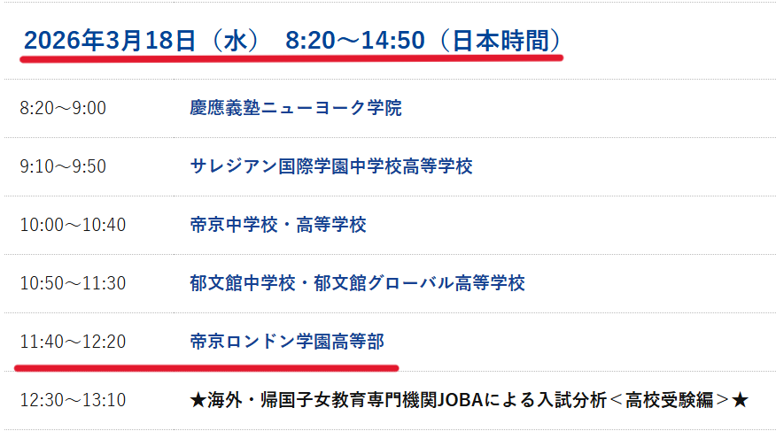 ニュース一覧 HOME NEWS 3月18日(水) オンライン説明会(JOBA主催) JAN 31 3月18日(水) オンライン説明会(JOBA主催) OTHER 2026年3月18日(水) よりオンライン説明会を開催します。IBディプロマプログラム、サッカーコース、アートコースの説明を行います。海外・帰国子女教育専門機関JOBA主催 11時40分~12時20分 ※要会員登録。帰国子女でなくてもご参加いただけます。 詳細はこちらから。 前のページへ戻る