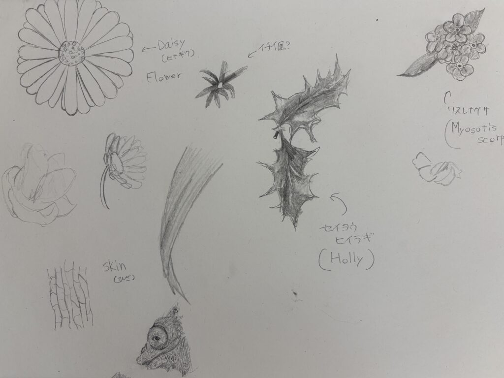 先生が持参してくださった、花や骨、松かさや貝などを見て描く授業もあれば、天気の良い日には学園内を自由に歩き回り、写真を撮ったりスケッチをしたりする授業の日もあります。